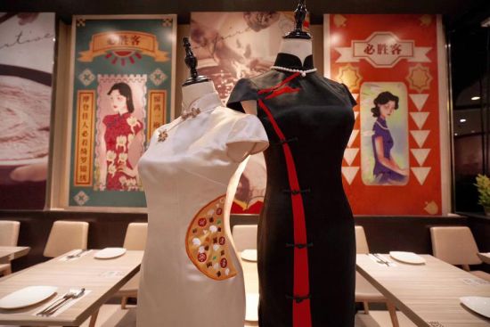 在“徐家匯源”中心區域的太平洋商場,煥然“變身”的必勝客餐廳人氣頗旺。 走進餐廳,首先映入眼簾的是兩件精致優雅的品牌定制款旗袍, 具有代表性的金黃色比薩和必勝客“紅帽子”巧妙地點綴在旗袍的一角,靈動自然。這種西餐廳里的旗袍首秀也吸引眾多消費者紛紛駐足。旗袍,是海派文化中濃墨重彩的一筆,它既有西方文化的開放又有東方文化的柔美,中西交融的顯著特性與必勝客的品牌內涵不謀而合。