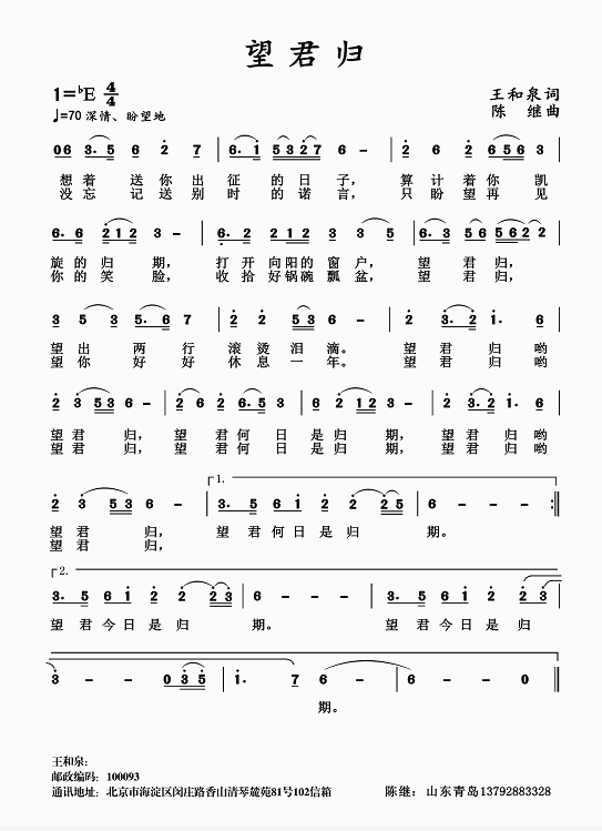 曲作者:陳繼,男,青島市人,生于1954年1月。系青島漁業公司退休職工。從小愛好音樂。曾參加中國詞曲高端名家培訓,獲中國歌舞劇院聲樂9級證書。系中國音樂文學學會會員,中國大眾音樂協會會員,青島市音樂家協會會員?,F任青島市北永佳合唱團指揮,無棣路社區合唱團指揮,青島漁業公司合唱團指揮。近年來共創作原創歌曲70余首,在正式音樂刊物上發表了二十余首,有十余首歌曲獲獎。