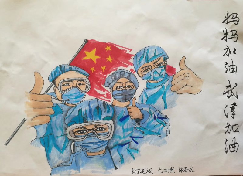 本會理事、故事委員會副主任林樹榮的兒媳婦20日出發去支援武漢,她曾獲上海市優秀護士。孫子畫畫支持媽媽。孫子13歲,擅長國畫,多次得獎。林圣杰的畫感動了大家,今天上海電視臺精神文明辦跟蹤我們送林圣杰拍攝全過程。