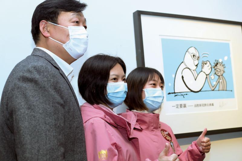 來自東方醫(yī)院的醫(yī)護(hù)人員在《一定要贏》的美術(shù)作品前合影。