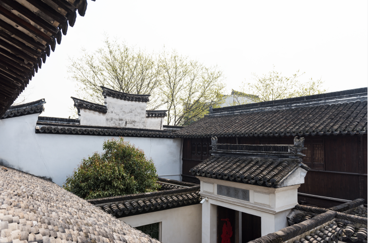 第二進的正廳為客廳,是主人會客之處。東西兩側各有房間,透過花格木窗,可欣賞南側小花園。穿過客廳,天井垂滿藤蔓,四周的屋檐與黑色的滴水瓦組成框景。“回”字形的木樓四周均采用大面積的玻璃窗,讓東西南北每一個面都能獲得采光與通風。