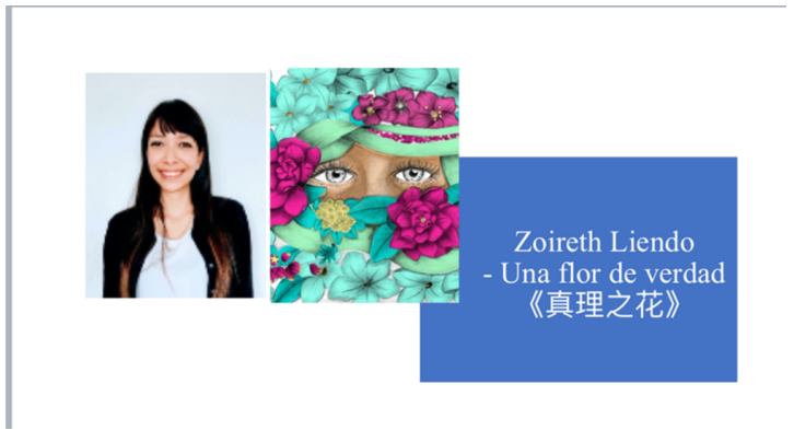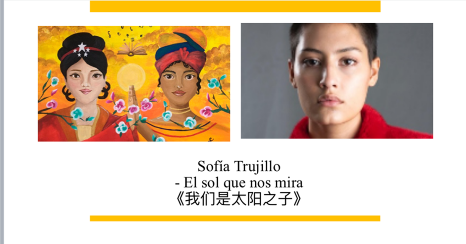 中國國禮畫家、中國畫院常務副院長,中國散文家協會副會長王紅莉,對成人業余組特等獎特魯希略創作的《我們是太陽之子》(SofíaTrujillo-Elsolquenosmira)格外喜愛,她說:兩位少女,一位身著漢服,一位身著哥民族服裝,青春亮麗,親如姐妹。朝陽突破云層,光芒萬丈,冉冉升起,花朵、祥云、音符、帶有美好寓意的漢子飄來無限祝福,象征中哥友誼光明燦爛,欣欣向榮。