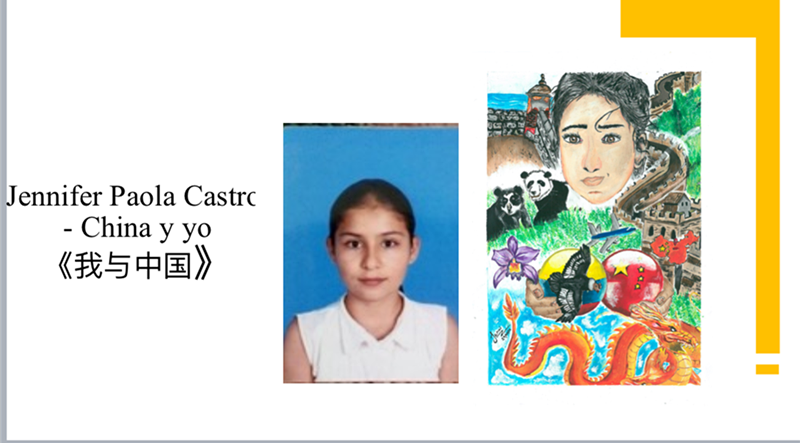 哥國家教育培訓中心主任埃斯特拉納,對青年組一等獎詹妮弗的《我與中國》(JenniferPaolaCastro-Chinayyo)贊不絕口,他說:小畫家巧妙地將長城、燈塔、巨龍,熊貓,安第斯山鷹、哥倫比亞古城堡、眼鏡熊、蘭花等一組組中哥文化符號均衡的描繪在畫面里,布局有序,相互對稱,特別是畫面中代表作者本人的小女孩懷抱繪有中哥兩國國旗裝飾的足球,似乎在祝福著上海綠地申花足球隊隊長、哥倫比亞籍球員莫雷諾率隊在卡塔爾參加亞洲冠軍聯賽取得好成績。整個畫面將中哥日益深厚的文化、非遺、旅游、體育交流盡情展現,凸顯中哥友誼的牢固與長久。