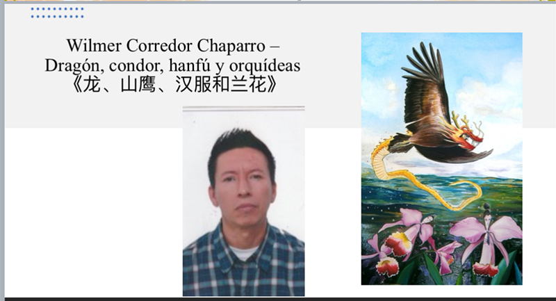 哥國立大學教授、1984年在華藝術系留學生佩雷斯,對成人專業組三等獎作品恰帕羅的《巨龍、山鷹、漢服與蘭花》(WilmerCorredorChaparro-Dragón,condor,hanfúyorquídeas)評論道:畫家憑借豐富而浪漫的想象力把遨游天際的東方巨龍和安第斯山鷹結合在一起,又把哥倫比亞的國花——蘭花轉化為身著漢服的古代仕女,中哥極具代表性的風物完美融合,中哥友誼盡展畫卷。