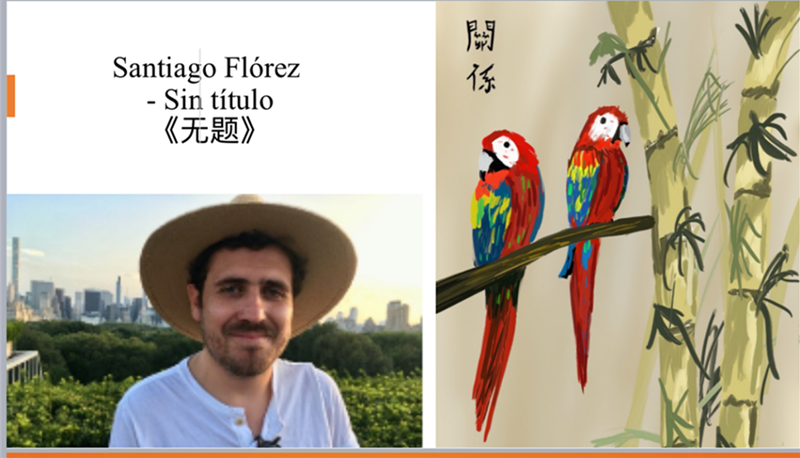 聯合國成立70周年世界華人繪畫大賽金獎獲得者、中國著名書畫家陳墨,這樣評價弗洛雷斯的《無題》(SantiagoFlórez-Sintítulo),他說,作品里呈現了多組象征中哥友誼的關系:華麗的鸚鵡和竹子即是中國人的摯愛,也深得哥倫比亞人民的喜愛,鸚鵡華麗的羽毛恰是中哥兩國國旗的顏色。作者特別用了中國傳統花鳥畫的漢語題字和西班牙語的姓名印章,展現出畫家對中國傳統花鳥畫的研究與理解。