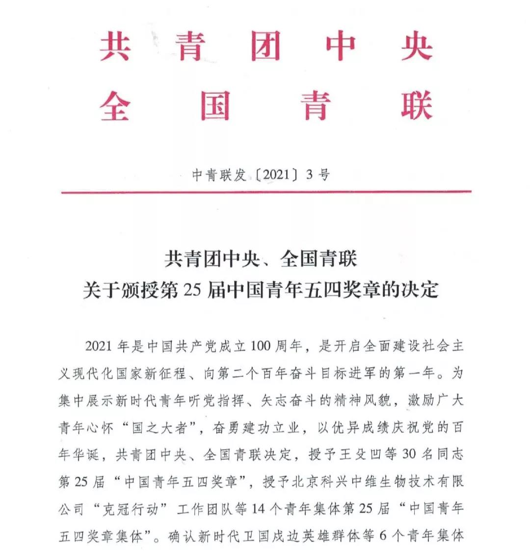 北京科興中維生物技術(shù)有限公司“克冠行動”工作團(tuán)隊(duì)。2020年,科興中維第一時間從研發(fā)、質(zhì)量和生產(chǎn)團(tuán)隊(duì)中優(yōu)選出52名青年組成工作團(tuán)隊(duì),打響了與時間賽跑的戰(zhàn)斗。52名青年不顧安危,直面?zhèn)魅拘詷O強(qiáng)、尚無特效藥的新冠病毒,穿著層層密封的防護(hù)裝備,在-65帕壓力缺氧狀態(tài)下,24小時不停休地奮戰(zhàn)在實(shí)驗(yàn)室中。他們嚴(yán)格堅(jiān)守質(zhì)量關(guān),攻堅(jiān)克難搶工期,竭盡全力保生產(chǎn),77天完成疫苗臨床前研究獲得臨床批件,77天完成成人組I/II期中期揭盲并被納入緊急使用,為全國乃至全世界抗疫作出了突出貢獻(xiàn)。