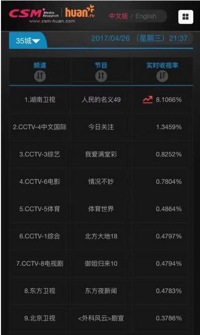在4月18日播出期間,該劇的CSM 52城市網(wǎng)收視率就已經(jīng)強(qiáng)勢(shì)破5,超越了范冰冰主演的大劇《武媚娘傳奇》曾經(jīng)創(chuàng)下的單集收視率最高紀(jì)錄。播至40集時(shí),《人民的名義》又在CSM 52城市網(wǎng)創(chuàng)下5.773%的單集收視率,單日超越2011年的收視神劇《回家的誘惑》,同時(shí)也刷新了近十年省級(jí)衛(wèi)視收視的最高紀(jì)錄。