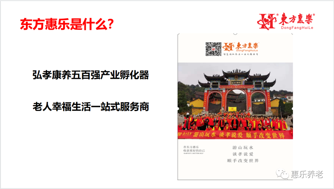 一是要提高認識,堅決服從集團大局,明確東方惠樂是什么——弘孝康養五百強產業孵化器,老人幸福生活一站式服務商。東方惠樂起步于2006年;已從一家創新型養老服務公司成長為科技型國際性連鎖機構;股票代碼DFHL,目前正在通過市場拓展、優質項目并購,啟動全球私募,推動進軍納斯達克主板及北京證券交易所。