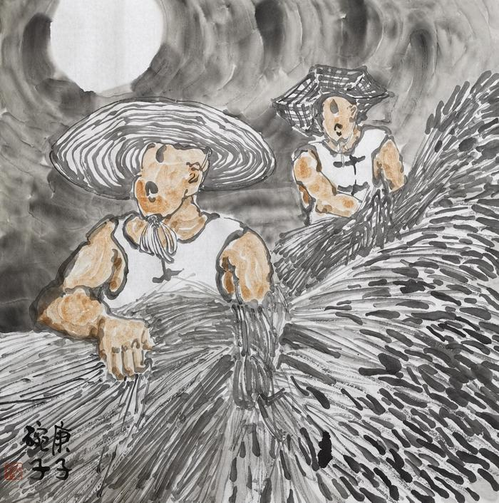 戴樹良的中國(guó)畫《芒種》布局層次分明,刻畫虛實(shí)有度,人物臉上喜悅的笑容奠定了畫面的情緒基調(diào)。