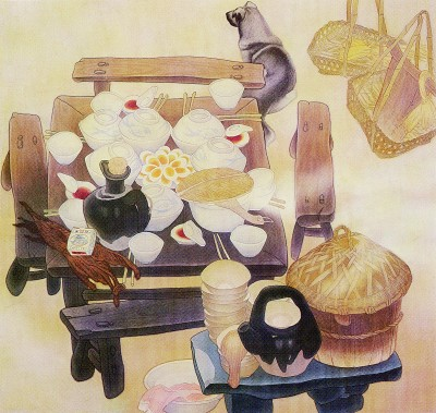 謝關(guān)鍵的《栽秧酒》中,臘肉、美酒、涼粉、豆腐、咸鴨蛋等擺上桌,這樣豐盛的一桌美食是鄉(xiāng)里鄉(xiāng)親快樂互助的情感交流。