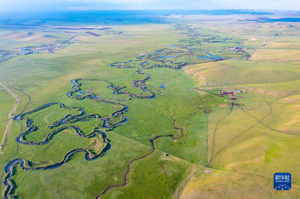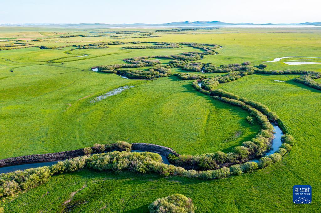 初夏時節,位于內蒙古自治區錫林郭勒盟東北部的烏拉蓋草原風景宜人,蔚藍色的天幕下,綠色的草原廣闊無垠,蜿蜒流淌的烏拉蓋河綿延向遠方,美如畫卷。