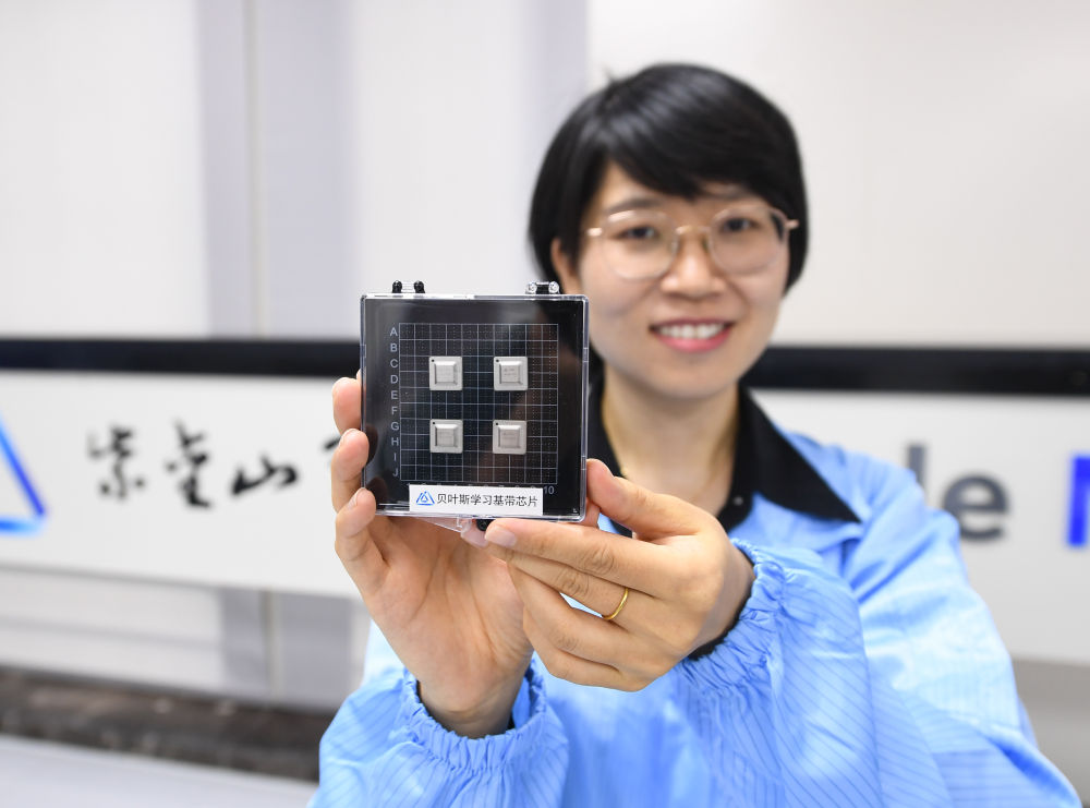 ??在南京紫金山實(shí)驗(yàn)室6G綜合實(shí)驗(yàn)室,科研人員展示自主研發(fā)的貝葉斯學(xué)習(xí)基帶芯片(2023年7月6日攝)。新華社記者季春鵬攝