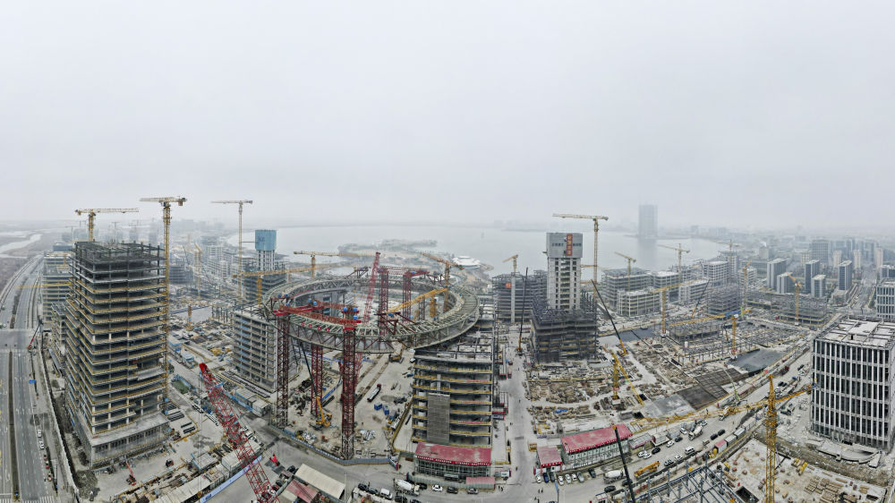 ??空中俯瞰建設(shè)中的上海臨港新片區(qū)滴水湖金融灣項(xiàng)目(2024年1月18日攝,無(wú)人機(jī)全景照片)。新華社記者方喆攝