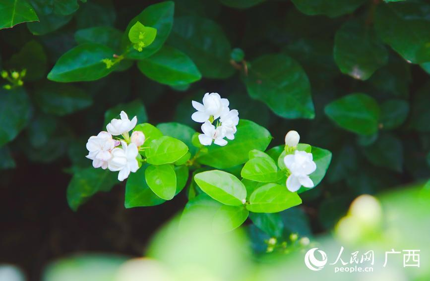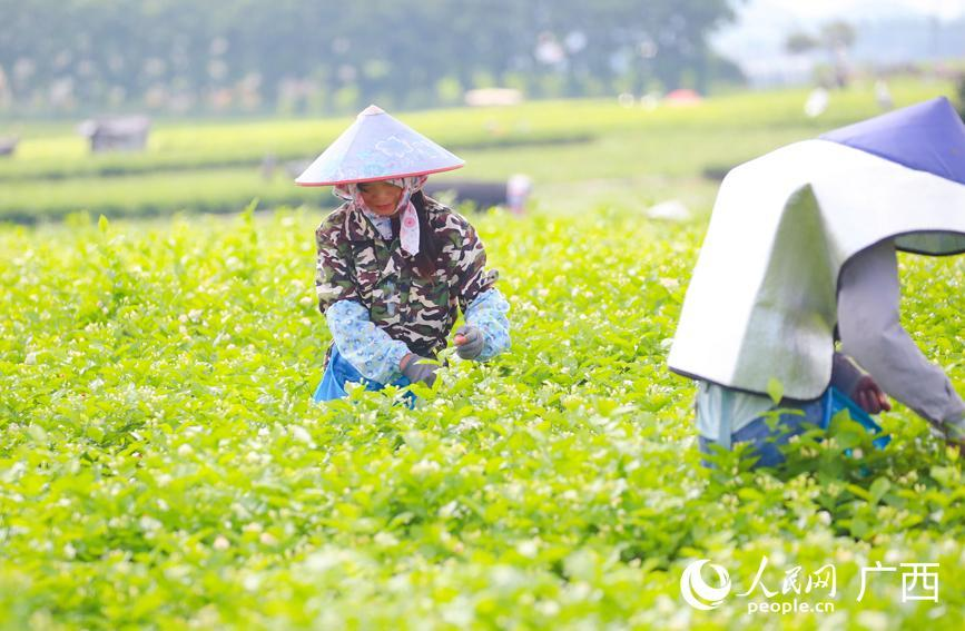 盛夏時節,廣西橫州市中華茉莉園,茉莉花在微風中搖曳,馥郁芬芳漫溢天地。花農穿梭花海之間,手法嫻熟地采摘茉莉花,一派繁忙景象。