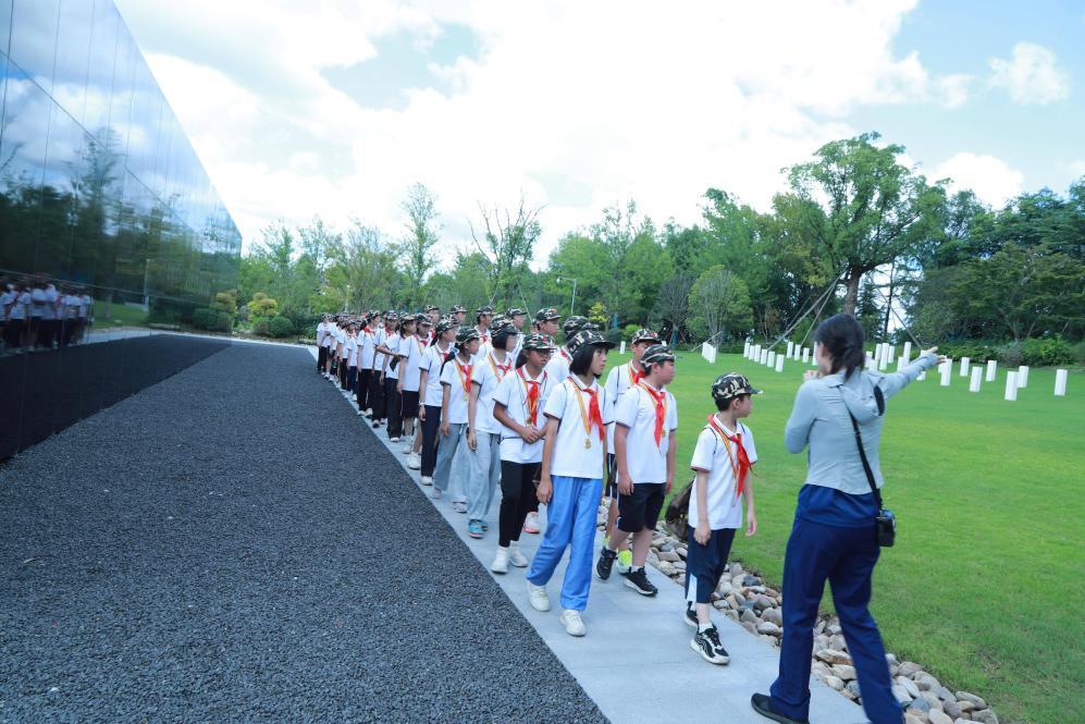第三天,孩子們前往中共四大紀念館,共同追尋革命先驅探尋道路的足跡;國旗教育展示館內,五星紅旗誕生的壯闊史詩蕩氣回腸。松江烈士陵園內,蒼松翠柏掩映著永恒的忠誠。孩子們瞻仰紀念碑,獻上鮮花,將最崇高的敬意獻給長眠于此的英魂。當《英雄贊歌》的莊嚴旋律在陵園上空回蕩,少年們以歌聲告慰先烈,唱出“烽煙滾滾唱英雄”“英雄的生命開鮮花”的豪情,他們用歌聲許下承諾:這盛世,薪火相傳,如您所愿!