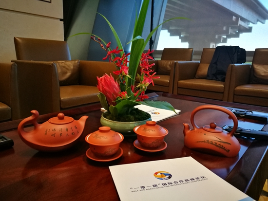 “一帶一路”高峰論壇的文藝晚會《千年之約》能讓人回味,美的如詩如畫,驚艷了世界,此刻,中國紫砂文化也閃耀亮相“一帶一路”高峰論壇?!耙粠б宦贰弊仙按髱煛舫森傁壬?,作為本次高峰論壇官方指定藝術家,由其創作的《紫韻東方·福臨五洲》讓人夢回漢唐,作品圍繞“一帶一路”主題,將2000年前絲綢之路的大漠之風、驚濤駭浪與新時代絲路內涵融入紫砂創作中,再次打開了各國友好交往的新窗口,各國領導人在圓桌峰會上及茶歇之余,共同感受中國紫砂韻味與世界的文化的交融與對話。