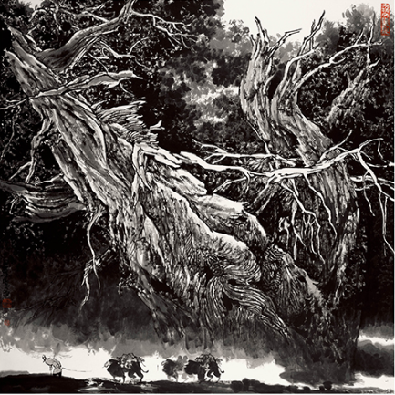 欣賞周尊圣的胡楊作品,看他用濃墨和線條勾畫出生命的傲岸與堅強,讓我們感受中國水墨無限的表現力和畫家嘔心瀝血所演奏的絲綢之路交響曲。正如著名的美術理論家、畫家,原人民美術出版社總編輯程大利著文評價周尊圣:從“天山紅”到“不朽的胡楊”展示了尊圣多年來的藝術足跡。這是一條融匯中西,注重時代精神的探索之路。