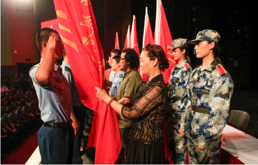 動員會最后,軍訓(xùn)團領(lǐng)導(dǎo)向各營、各連授旗,會場氣氛莊嚴(yán)、熱烈。