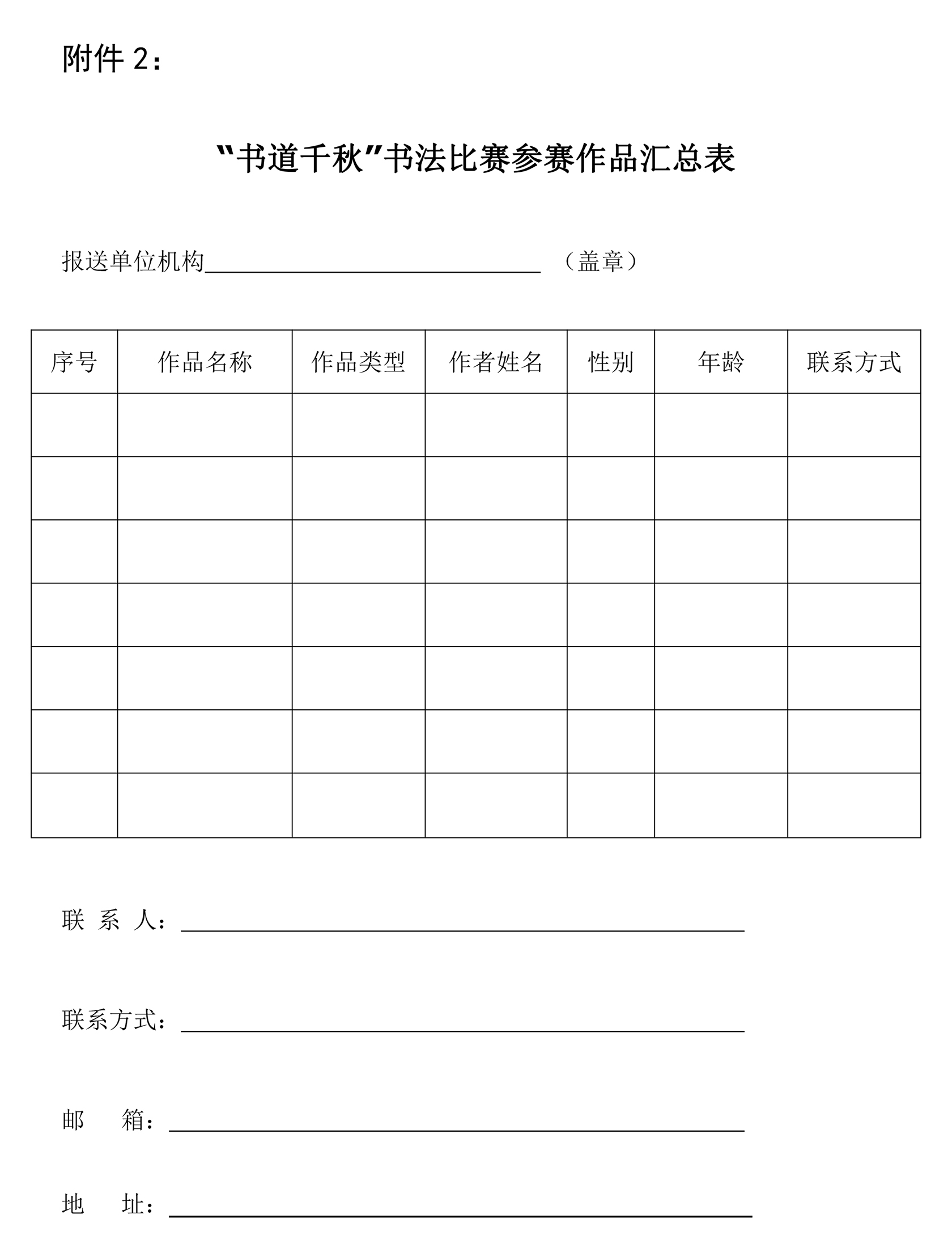 6、鼓勵(lì)學(xué)校書法團(tuán)體、社會(huì)藝術(shù)培訓(xùn)機(jī)構(gòu)以及民間書法群體等團(tuán)體參賽。作品由各團(tuán)體統(tǒng)一報(bào)送至上海文藝網(wǎng)《書畫頻道》辦公室,并附《參賽作品匯總表》(附件2)。如團(tuán)體參賽,每一團(tuán)體應(yīng)選送各類書法作品至少20幅。報(bào)送截止日期為2017年8月20日。