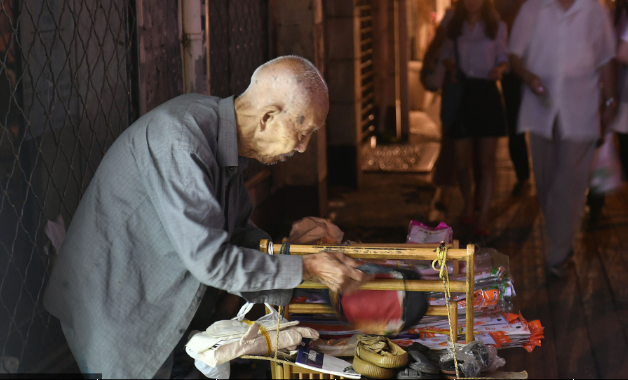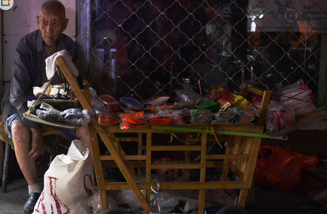 京城8月的天氣仍有些炎熱,17日下午3點,一位107歲的老人,推著裝了一摞摞鞋墊的小車,緩緩來到傳媒大學西門對面的墻跟下,在一家門面前將小車上的塑料布揭開,拿出鞋墊,等待顧客上門。