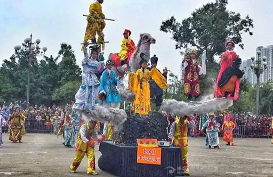 戲曲飄色方陣由井岸鎮(zhèn)和乾務(wù)鎮(zhèn)聯(lián)袂演出。該方陣由大將、小將、宮女、小兵、地色和《詠春》、飄色等構(gòu)成,演員達(dá)230多人。方陣采用40名大將及48名小將(種戲曲角色),配以40名宮女和40名小兵、詠春20人、3臺飄色組成的戲曲飄色方陣,將幾者有機(jī)結(jié)合,互動表演,形成二維視覺藝術(shù)效果,充分展示我區(qū)曲藝之鄉(xiāng)的魅力。