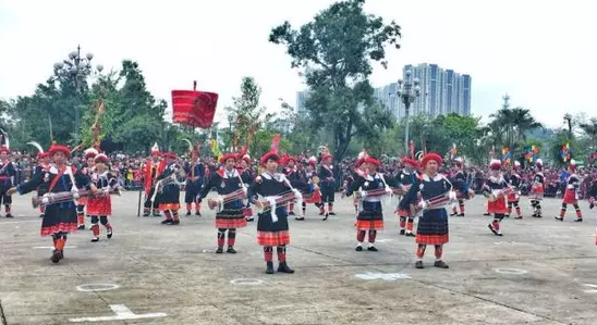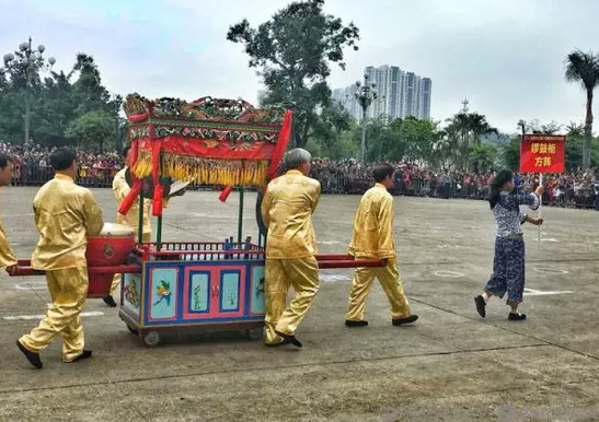 喜慶歡樂、本土氣息濃郁的斗門水上婚嫁方陣由白蕉鎮(zhèn)表演。“斗門水上婚嫁”習(xí)俗是國家級非遺名錄。該方陣由新郎、新娘、大妗姐、伴郎、伴娘、船家、婚童等構(gòu)成,演員達(dá)160多人。表演形式:由20條旱船組成,每一條船都按水上婚嫁花船設(shè)計。船上站新娘,大妗姐撐紅傘,伴郎手提雞鴨,伴娘手提禮品籃,船家手提椰子,船邊新郎、婚童手拿小燈籠和鞭炮。現(xiàn)在,花船、新郎、新娘、大衿姐和民歌手正在花船上表演祭龍王、拜高堂等場景,船下有20名鬧婚的小孩子。