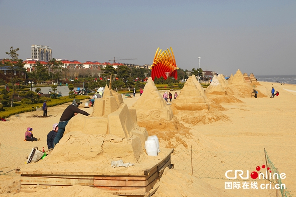 ??4月8日,在威海南海新區金灘上,三臺挖掘機正在進行地面平整工作,工作人員正在對最后幾座沙坯進行圍架,用于沙雕節的沙堆基本成型,來自國內外的20多名沙雕師已經開始著手進行雕刻。據了解,第十一屆威海沙雕文化藝術節將于4月29日在南海新區正式開幕。