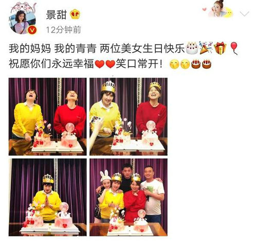 4月17日是景甜的母親和景甜助理的生日,小甜甜曬出了照片四宮格,并祝福道:我的媽媽,我的青青,兩位美女生日快樂,祝愿你們永遠幸福,笑口常開!