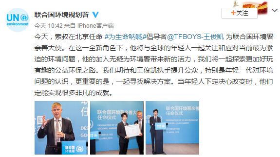 @聯(lián)合國環(huán)境規(guī)劃署4月18日消息,今天,索叔在北京任命 #為生命吶喊#倡導(dǎo)者@TFBOYS-王俊凱 為聯(lián)合國環(huán)境署親善大使。在這一全新角色下,他將與全球的年輕人一起關(guān)注和應(yīng)對當(dāng)前最為緊迫的環(huán)境問題,他的加入無疑為環(huán)境署帶來新的活力,我們將一起探索更加好玩有趣的公益環(huán)保之路。我們期待和王俊凱攜手提升公眾,特別是年輕一代對環(huán)境問題的認(rèn)識,更重要的是,一起尋找解決方案。當(dāng)年輕人下定決心改變時,他們定能實現(xiàn)很多非凡的成就。