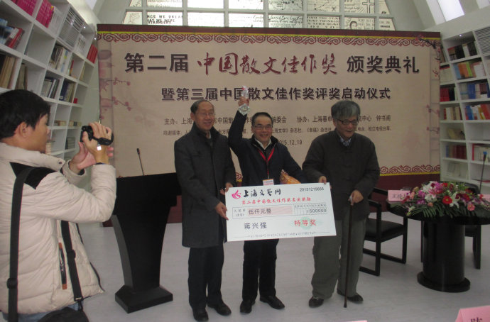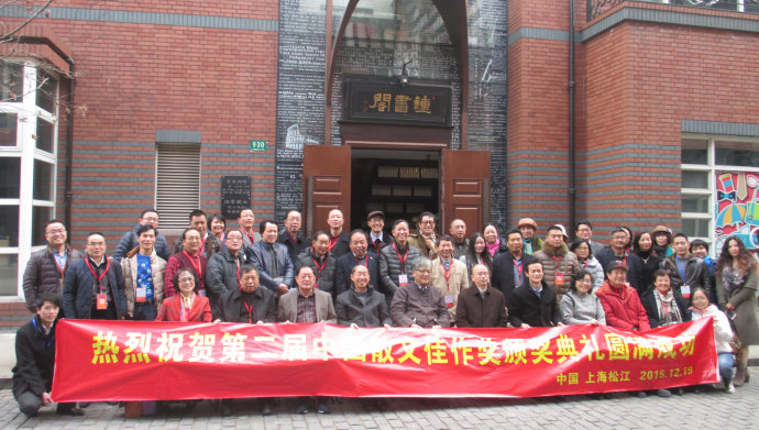 2015年12月19日,由上海文藝網,《中國散文佳作精選集》編委會主辦,上海春申文化藝術交流中心、鐘書閣書店協辦的第二屆中國散文佳作獎頒獎典禮暨第三屆中國散文佳作獎啟動儀式在“最美書店”鐘書閣如期舉辦。中國作家協會網絡文學委員會副主任、上海市作家協會副主席、上海網絡作家協會會長陳村,原《文學報》總編輯陳歆耕,《文匯報》副總編輯繆克構,上海社會科學院文學研究所研究員、中國現當代文學研究室主任潘頌德,松江區文聯常務副主席許平,閔行區文聯副秘書長宋海年,閔行區作家協會副會長陸飄,復旦大學中文系教授葛乃福,上海財經大學中文系研究室教授顧國柱,上海大學中文系副教授任麗青,上海浦東詩社社長嚴志明,中國散文詩作家協會副主席秦華,上海鐘書閣書店負責人徐雅娥,松江區文廣系統代表錢敏、上海文藝網總編輯畢凌鋒,上海文藝網副總編伊劍等嘉賓應邀出席。