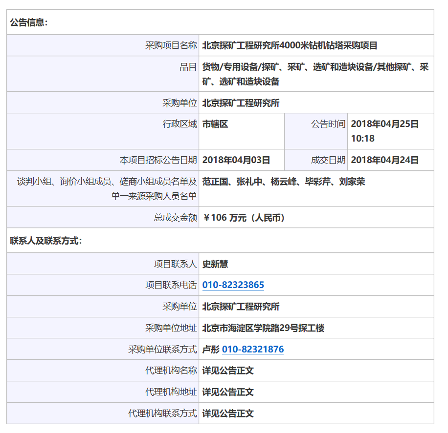 北京探礦工程研究所4000米鉆機鉆塔采購項目”項目(項目編號:) 組織評標工作已經結束,現將評標結果公示如下: