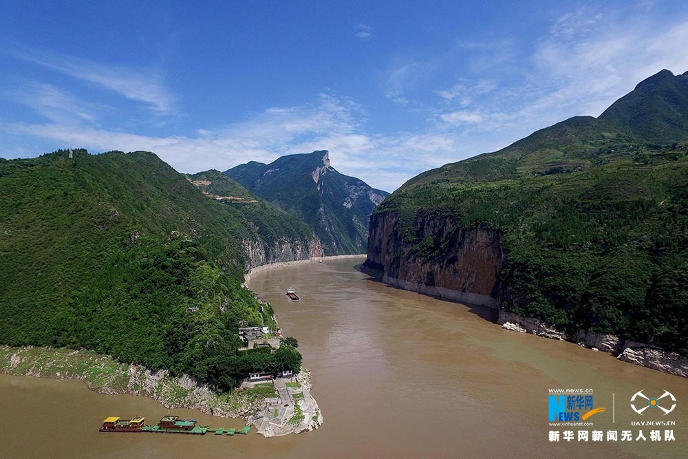 重慶地處長江上游和三峽庫區腹心地帶,推動長江經濟帶發展必須走生態優先、綠色發展之路,使綠水青山產生巨大生態效益、經濟效益、社會效益。圖為無人機航拍長江三峽瞿塘峽。