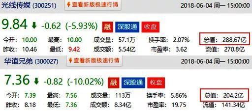 光線2018年第一季度歸屬于上市公司股東的凈利潤為19.93億,較上年同期增長976.95%(包括了賣出新麗傳媒股份給騰訊的投資收入,如果除去,光線的凈利潤約0.43億-1.43億,同比下滑23%-77%)。截止6月4日,光線傳媒股價9.84元,總市值288.7億。