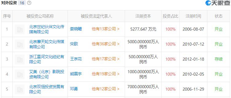 耀萊文化產業股份屬于綦建虹,此人是成龍的好搭檔和品牌使用者,名下有港股上市公司耀萊集團(主營名車、名表、珠寶、名酒等頂級奢侈品)、北京耀萊投資、耀萊文化傳媒、耀萊航空投資等“耀萊系”產業。君聯嘉睿里有馮小剛、張國立、李冰冰、黃曉明四位明星股東,前三人各出資2000萬,黃曉明出資1500萬。