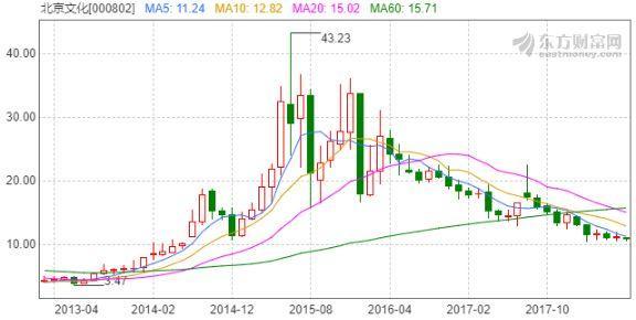 接著經歷了一波小的反彈,北京文化的股價又持續下跌。截止2018年6月4日,已跌至10.8元,總市值78.1億,刷四年來新低。