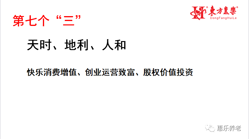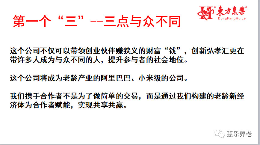 第一個“三”:與眾不同的三個方面。今天你們來到了一個與眾不同的公司,這個公司與眾不同有三點:1、這個公司不僅可以帶領創業伙伴賺狹義的財富“錢”,創新弘孝匯更在帶許多人成為與眾不同的人,懂得創造社會價值,促進社會進步,進而提升參與者的社會地位。2、這個公司將成為老齡產業的阿里巴巴、小米級的公司,參與建設具有無限未來。3、我們攜手合作者不是為了做簡單的交易,而是通過我們構建的老齡新經濟體為合作者賦能,實現共享共贏。東方惠樂平臺將讓社區老人更幸福,幫政府社區為老服務工作提升內涵,幫助更多涉老服務機構、產品供應機構釋放產能、增加收益。