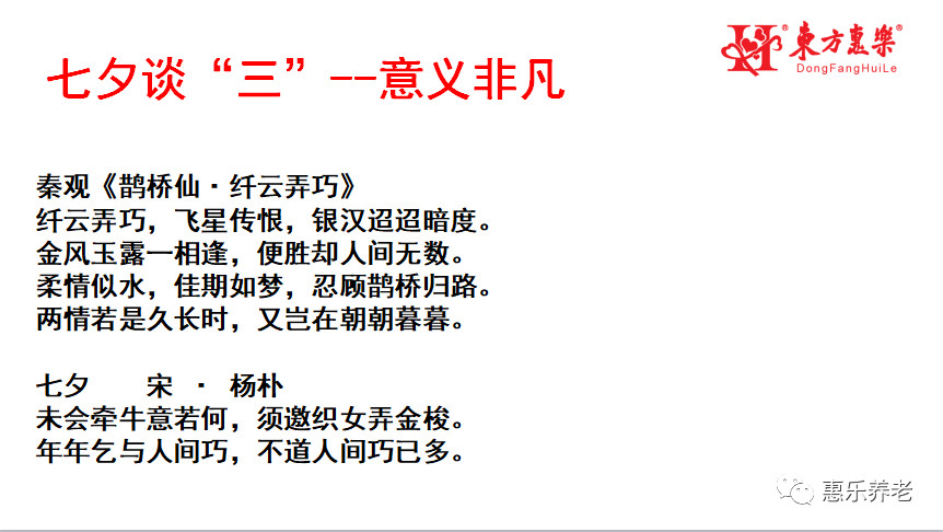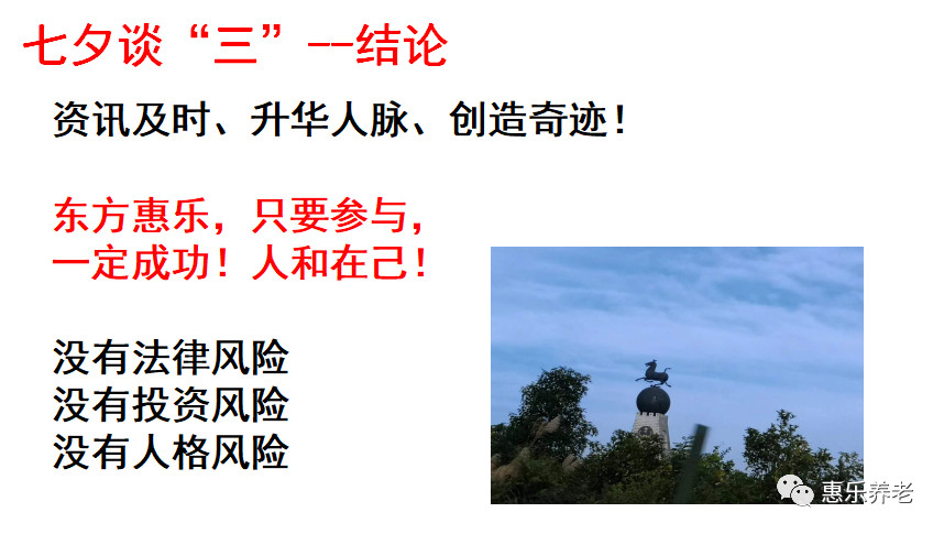 結語:七夕談三,三生萬物。今天是中國傳統的節日,是牛郎織女鵲橋相會的美好期待日子。秦觀《鵲橋仙》“纖云弄巧,飛星傳恨,銀漢迢迢暗度。金風玉露一相逢,便勝卻人間無數。柔情似水,佳期如夢,忍顧鵲橋歸路。兩情若是久長時,又豈在朝朝暮暮。”是一種期盼,是一種無奈。宋·楊樸“未會牽牛意若何,須邀織女弄金梭。年年乞與人間巧,不道人間巧已多”則是一種喜悅。中國老人因為東方惠樂智慧循環享老平臺的出現,已經讓多年期盼、美好期待都變成了現實!“天生道,道生一,一生二,二生三,三生萬物”,今天,你們來到了東方惠樂,知道了許多“三”,通過資訊的及時掌握,就可以實現價值傳播升華人脈效應,成為創造奇跡的一員!這就是三生萬物!人和在己:沒有法律風險,沒有投資風險,沒有人格風險!東方惠樂,只要參與,一定成功!
