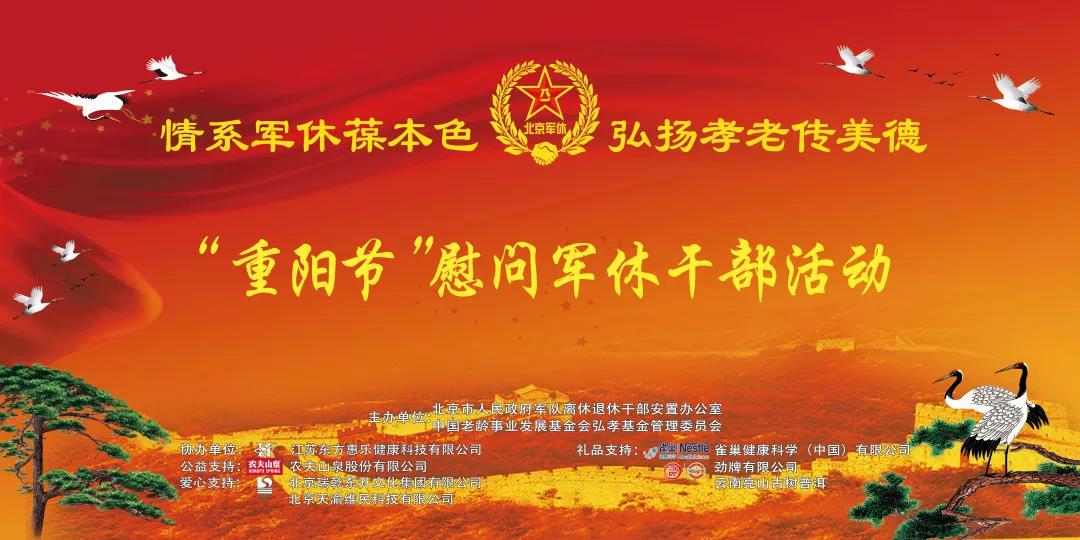 北京市軍休辦貫徹習近平新時代中國特色社會主義思想,堅持以黨的創新理論為指導,為實現軍休干部對美好生活的向往,積極進取、大膽探索,不斷為軍休事業發展注入新的活力,助力實現中國夢、強軍夢。弘孝基金是中國老齡事業發展基金會所屬,以弘揚孝道為主旨的專項公募基金。中國老齡事業發展基金會是經民政部批準,全國老齡辦領導下的以“幫天下兒女盡孝,替世上父母解難,為黨和政府分憂”為宗旨的公益慈善組織。弘孝基金管理委員會下設影視傳媒中心、活動中心、公益事業中心。此次,北京市軍休辦攜手弘孝基金管理委員會共同舉辦重陽節慰問軍休干部活動是對中華敬老優秀傳統的生動詮釋,彰顯了對共和國老兵的關愛。
