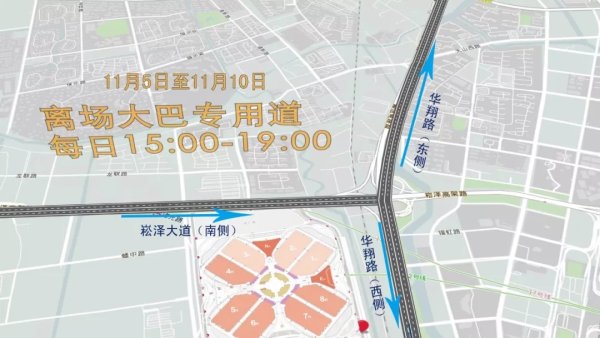 11月5日至11月10日,S26滬常高速入城段(收費站-嘉閔立交)雙側、華翔路(崧澤大道-滬青平公路)西側、華翔路(崧澤大道-北青公路)東側以及崧澤大道(蟠臻路-華翔路)南側設置進博會公交專用道,標注時段內(S26滬常高速入城段7時至10時,15時至19時,其余道路15時至19時),除公共汽(電)車、正在載人的核定載客人數二十人以上的載客汽車以及執行公務的警車、消防車、救護車和工程搶險車外,其他車輛禁止通行。