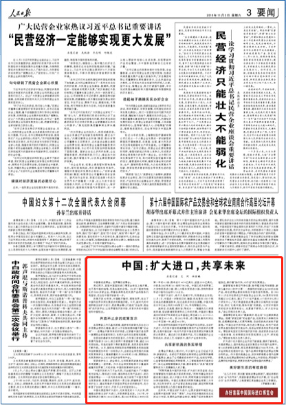 人民日報(bào)11月3日報(bào)道,再過兩天,首屆中國國際進(jìn)口博覽會(huì)將在上海開幕。這不是中國的獨(dú)唱,而是各國的合唱。130多個(gè)國家和地區(qū)的3000多家企業(yè),帶著各具特色的優(yōu)質(zhì)產(chǎn)品和服務(wù)閃亮登場,邁出在中國市場新的一步。