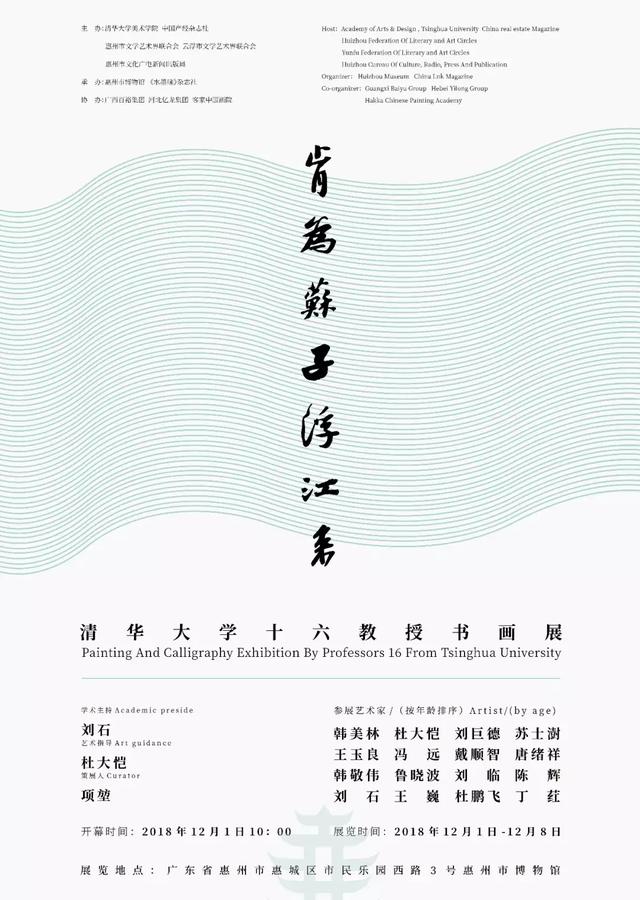 由清華大學(xué)美術(shù)學(xué)院、中國產(chǎn)經(jīng)雜志社、惠州市文學(xué)藝術(shù)界聯(lián)合會、云浮市文學(xué)藝術(shù)界聯(lián)合會、惠州市文化廣電新聞出版局主辦,惠州市博物館、《水墨味》雜志社承辦,廣西百裕集團、河北億龍集團、客家中國畫院聯(lián)合協(xié)辦的“肯為蘇子浮江來——清華大學(xué)十六教授書畫展”,12月1日上午十點在惠州市博物館盛大開幕。