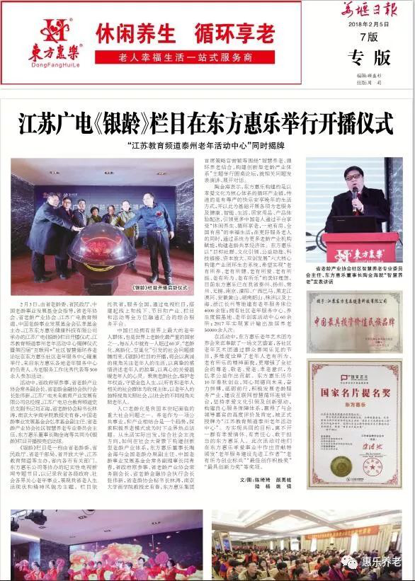 2018年2月3日,由江蘇省老齡委、江蘇省民政廳、中國老齡事業發展基金會指導,江蘇省老年協會、江蘇省老齡產業協會、 江蘇廣電教育頻道、中國老齡事業發展基金會弘孝基金主辦,江蘇東方惠樂健康科技有限公司承辦的“江蘇廣電《銀齡》欄目開播儀式、江蘇教育頻道泰州老年活動中心揭牌儀式暨第四屆“互聯網+”社區智慧循環養老論壇在泰州隆重舉行。