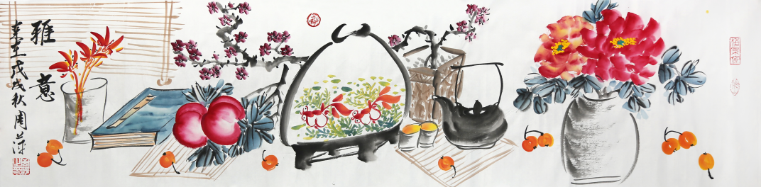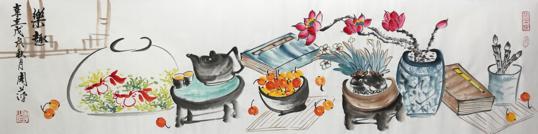 周萍的花鳥作品筆意新穎,筆墨酣暢,意隨心到,富有情趣。筆下石榴等也一一入畫,極富生活氣息。作品色墨并用,渾厚蒼勁,再配以畫上所題寫的真趣盎然的詩文和灑脫的書法相得益彰。
