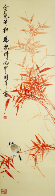 周萍花鳥作品布局精構,隨靈感隨即勃發,于是凝神靜氣構思,舉筆潑墨,一氣呵成,葉子和枝干疏密撘配,天然成趣,各有真態,彰顯氣韻,葉與筋勾染筆筆精到,筆法簡練,構圖簡潔,墨色渲染虛實對比清晰自然,使之曲盡其美,富有動感,使作品從雅中升華高度,達到致美。