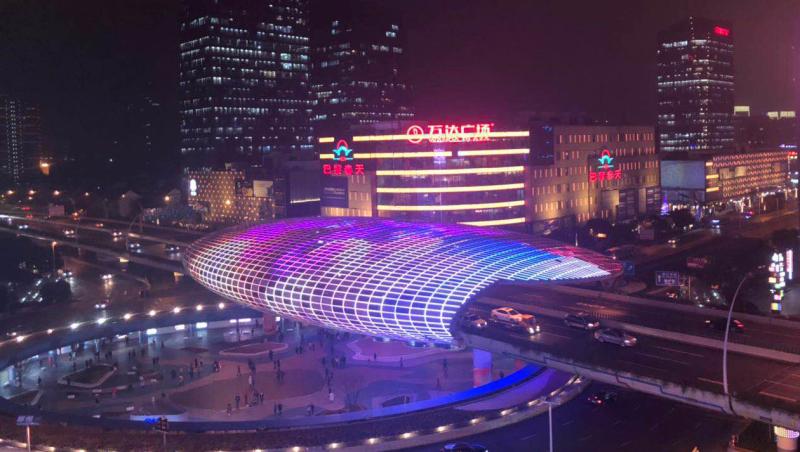 此次景觀燈光提升定位為:創(chuàng)造五角場區(qū)域地標,統(tǒng)籌引領(lǐng)商圈整體發(fā)展。從多個視角對“彩蛋”全方位的夜景思考,一方面加強“彩蛋”蛋體結(jié)構(gòu)上的基礎(chǔ)燈光,對“彩蛋”整體經(jīng)緯線燈具進行更換,改用高效環(huán)保的LED線條燈,燈具色彩更飽和,像素更高,更新管線和燈具,提升燈具質(zhì)量;另一方面更新提升控制系統(tǒng),控制協(xié)議采用DMX512,控制到單個像素點(單個燈具),控制精度更高,同時支持65535級更多灰度變化,色彩還原度更高,可以更加細膩更清晰地表現(xiàn)色彩,視頻像素更高。