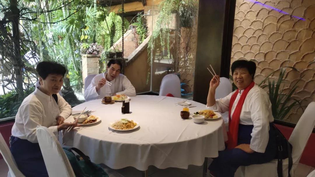 都說人一玩嗨了不容覺得餓,轉著轉著就到了晚飯時間,肚皮就咕咕作響了。這不,剛回到基地酒店邊的當地特色餐館,一個館子滿是“東方惠樂紅”,已經吃起來了!