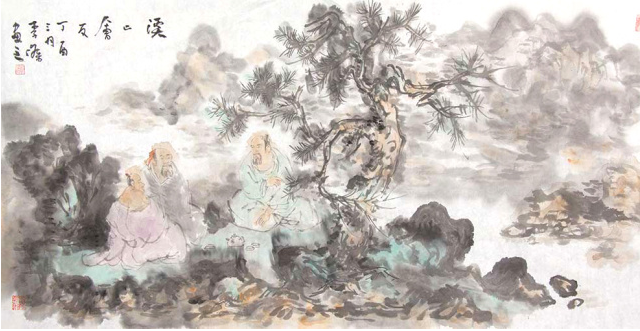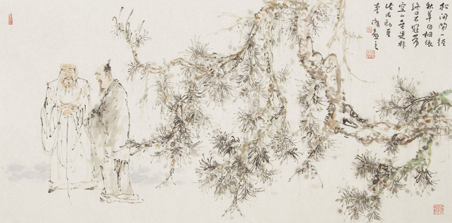 中國人物畫歷史悠久,形成了獨(dú)特的傳統(tǒng),通過足以顯現(xiàn)人物內(nèi)在本質(zhì)的外形的描寫,真實(shí)地展示不同人物的性格、個(gè)性與內(nèi)心世界。畫家李杰的這幅國畫人物作品《松間開一徑》,題款線索出自唐代司馬扎《隱者·松間開一徑》:“松間開一徑,秋草自相依。終日不冠帶,空山無是非。投綸溪鳥伴,曝藥谷云飛。時(shí)向鄰家去,狂歌夜醉歸。”畫面上的兩位古人佇立于蒼松下,他們頭頂身后一束旁逸斜出的古樹襯托整個(gè)畫面;遠(yuǎn)處是蒼茫的天空,給人以空靈曠遠(yuǎn)的感覺。作品構(gòu)圖嚴(yán)謹(jǐn),設(shè)色濃郁,題款考究,充滿意蘊(yùn)。