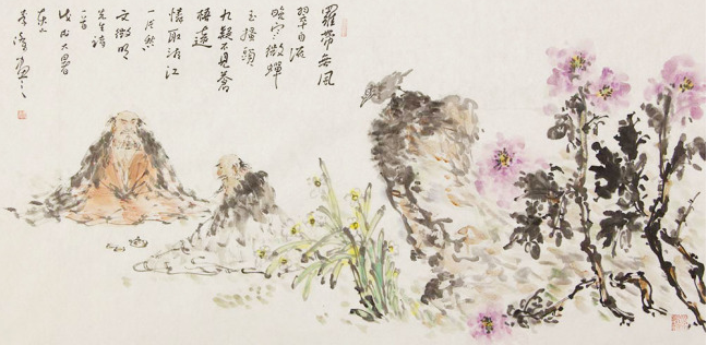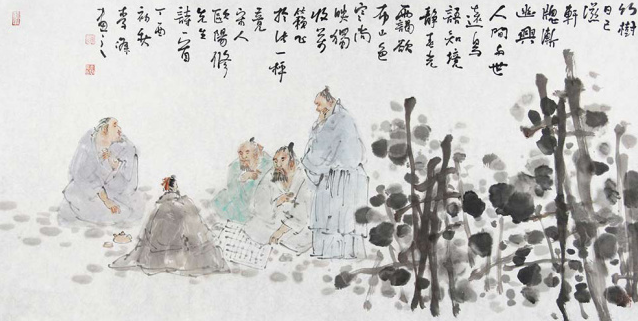 畫家李杰的這幅國畫人物作品《竹樹日已滋》,描繪了幾個(gè)古人在樹下聚會(huì)消遣的場景。題款線索出自宋代歐陽修《新開棋軒呈元珍表臣》:“竹樹日已滋,軒窗漸幽興。人間與世遠(yuǎn),鳥語知境靜。春光靄欲布,山色寒尚映。獨(dú)收萬籟心,于此一枰競。”畫面上樹木蓊郁,造型古雅,枝椏參差;幾個(gè)人在樹旁或坐或站,形態(tài)各異。作品追求濃郁的古風(fēng)特色,具有一種時(shí)空上的久遠(yuǎn)感,表現(xiàn)出了古人浪漫的生活情境。
