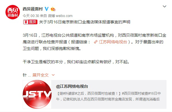 針對此前西貝南京店被檢查出衛生問題,西貝莜面館官方微博18日凌晨發聲明致歉。