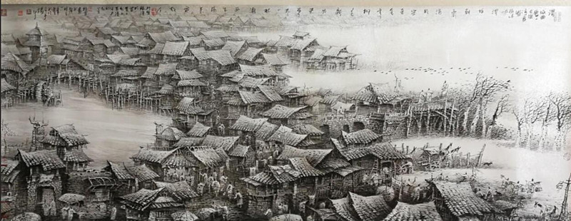 《渭城曲》作者;郭杭建規格;180X90Cm 唐人詩意糸列作品之一唐.王維《渭城曲》詩意圖及作品局部。其原作為渭城朝雨浥輕塵,客舍青青柳色新。勸君更盡一杯酒,西出陽關無故人。